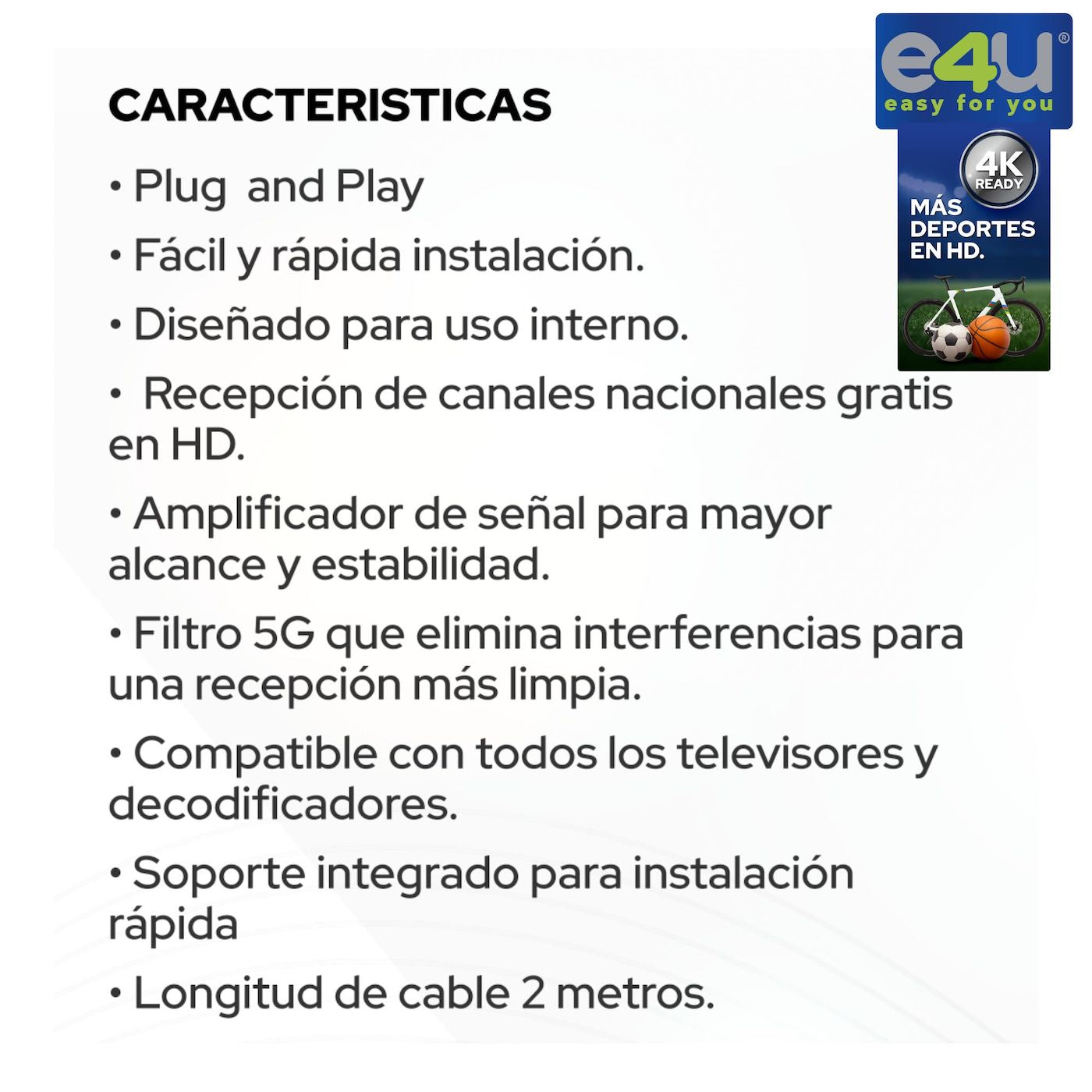 Disfruta la televisión sin esperas y sin interrupciones. Esta antena digital Mimetizada capta la señal TDT con máxima estabilidad gracias a su amplificación integrada y filtro 5G, eliminando interferencias para una imagen nítida y sonido claro.